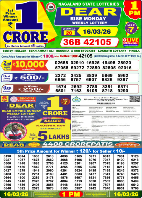 Check today’s Lottery Sambad results for 1 PM, 6 PM and 8 PM draws. Get Dear Morning, Sikkim Dear Day and Dear Night winning numbers live.