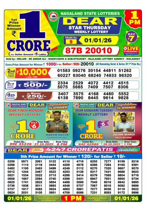 Check today’s Lottery Sambad results for 1 PM, 6 PM and 8 PM draws. Get Dear Morning, Sikkim Dear Day and Dear Night winning numbers live.