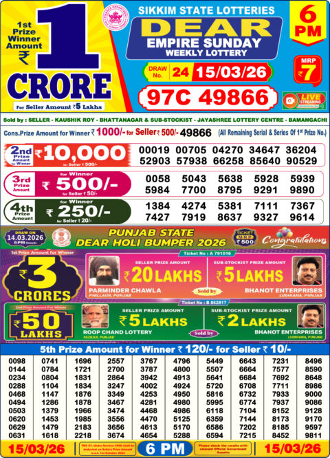 Dear Lottery Sambad 6 PM Result 15 03 26 – Sikkim State