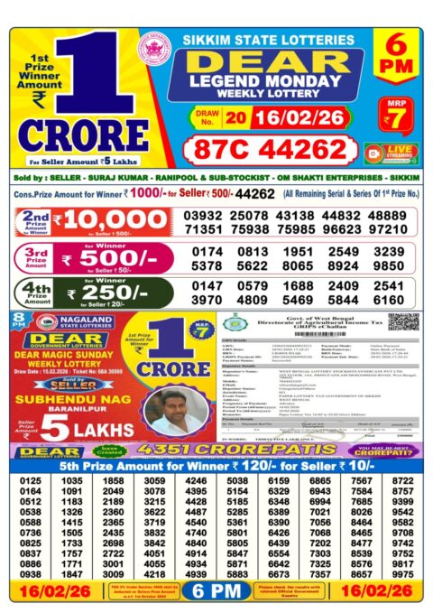 Dear Lottery Sambad 6 PM Result 16 02 26 – Sikkim State