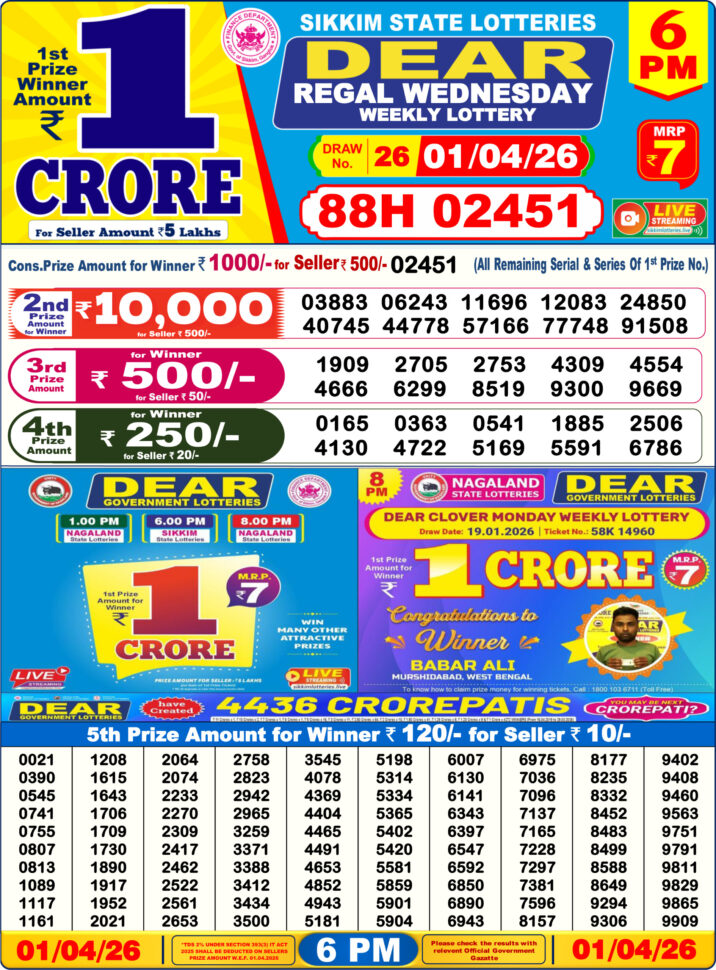 Today’s 01/04/26 scheme for the 6 PM draw is Dear Regal Wednesday Weekly Lottery Result.