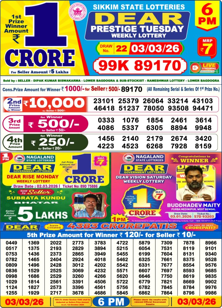 Today’s 03/03/26 scheme for the 6 PM draw is Dear Prestige Tuesday Weekly Lottery Result.