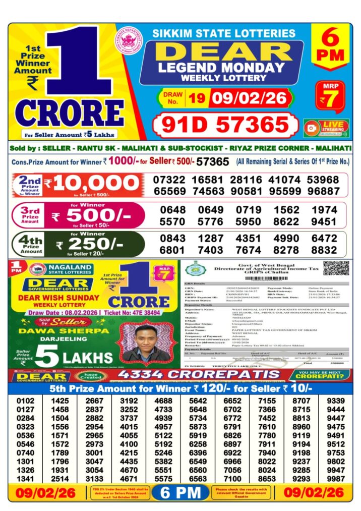 Today’s 09/02/26 scheme for the 6 PM draw is Dear Legend Monday Weekly Lottery Result.