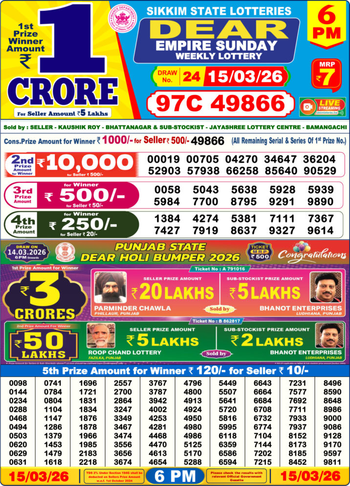 Today’s 15/03/26 scheme for the 6 PM draw is Dear Empire Sunday Weekly Lottery Result.