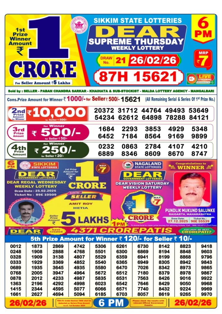 Today’s 26/02/26 scheme for the 6 PM draw is Dear Supreme Thursday Weekly Lottery Result.