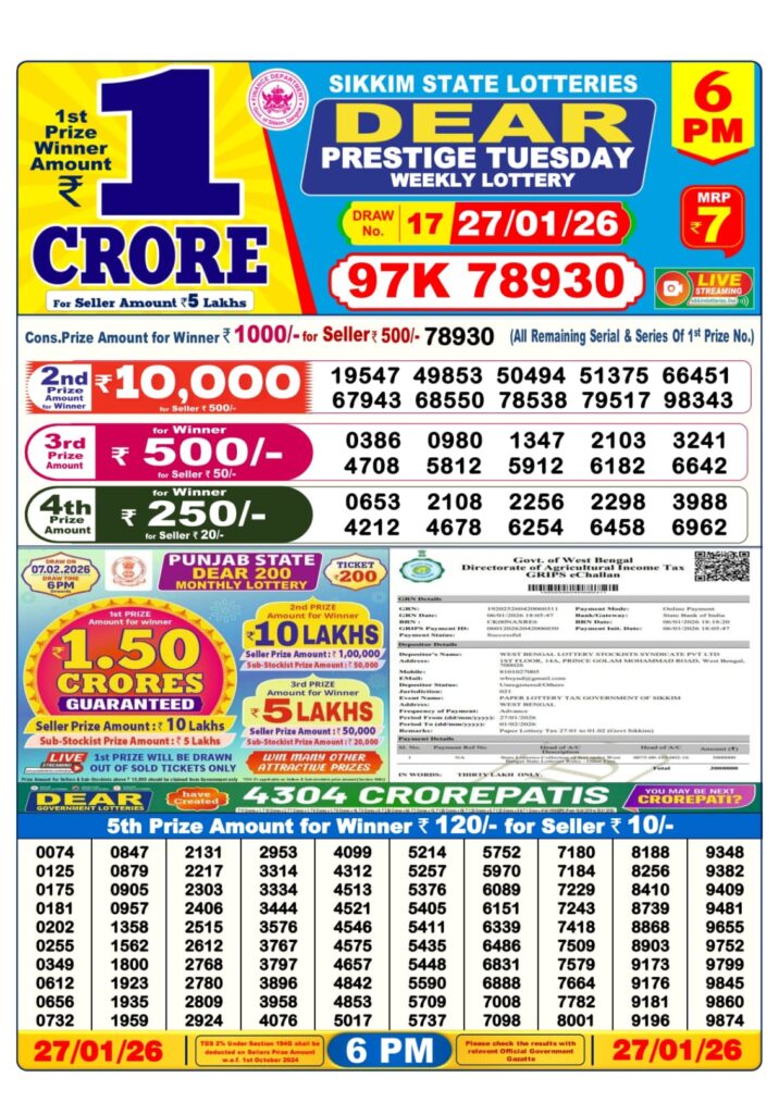 Today’s 27/01/26 scheme for the 6 PM draw is Dear Prestige Tuesday Weekly Lottery Result.