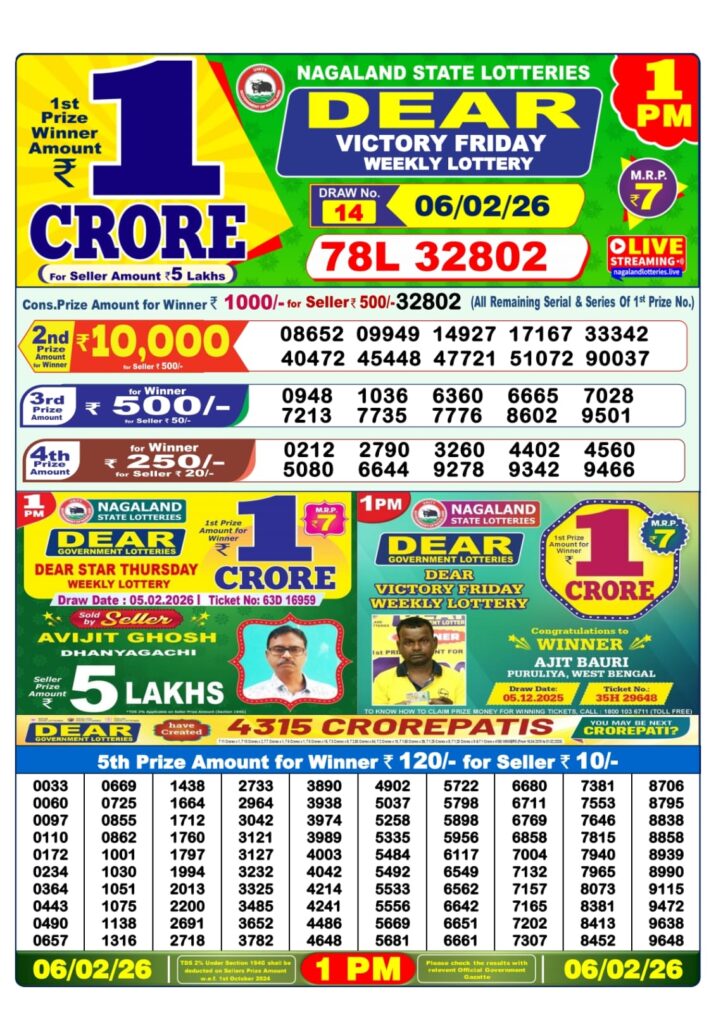Today’s 06/02/26 scheme for the 1 PM draw is Dear Victory Friday Weekly Lottery Result.
