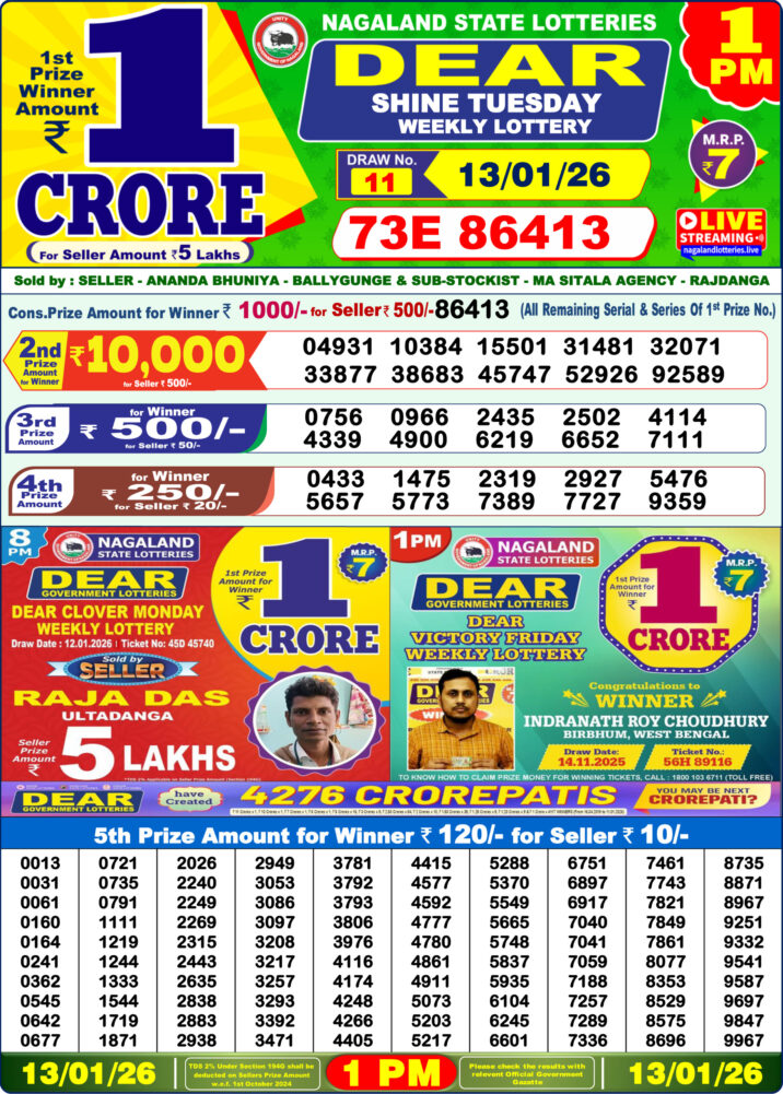 🕒 Update (12:01 AM): You can check the result of Lottery Sambad 1 PM Result 13/01/26 here for the scheme Dear Shine Tuesday weekly lottery result from 1 PM.