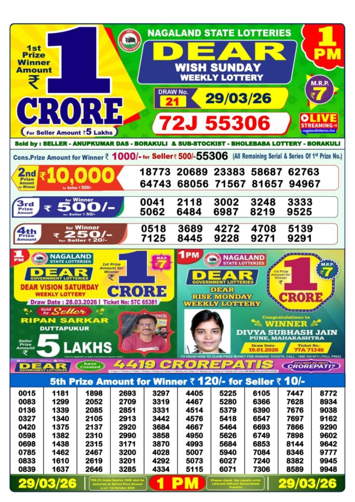 Today’s 29/03/26 scheme for the 1 PM draw is Dear Wish Sunday Weekly Lottery Result.