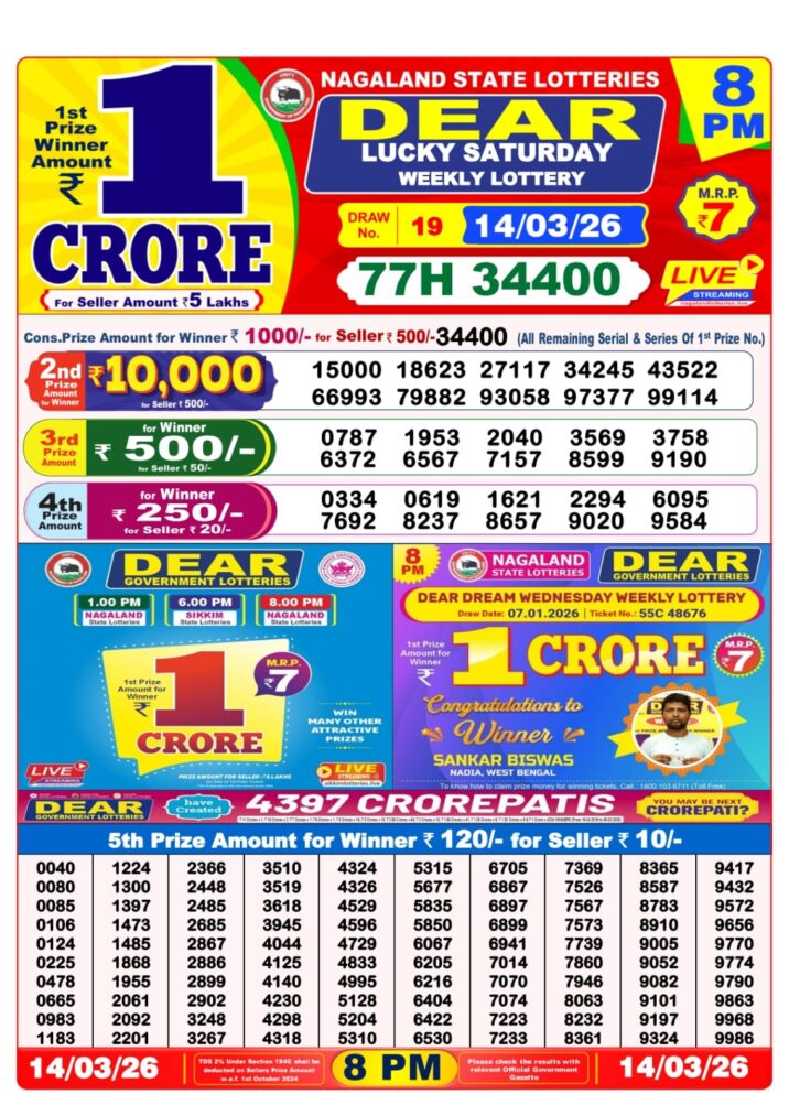 Today’s 14/03/26 scheme for the 8 PM draw is Dear Lucky Saturday Weekly Lottery Result.