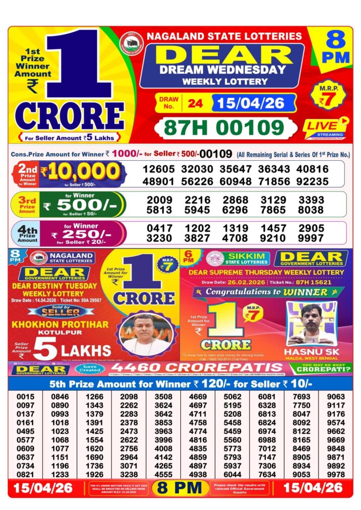 Today’s 15/04/26 scheme for the 8 PM draw is Dear Dream Wednesday Weekly Lottery Result.