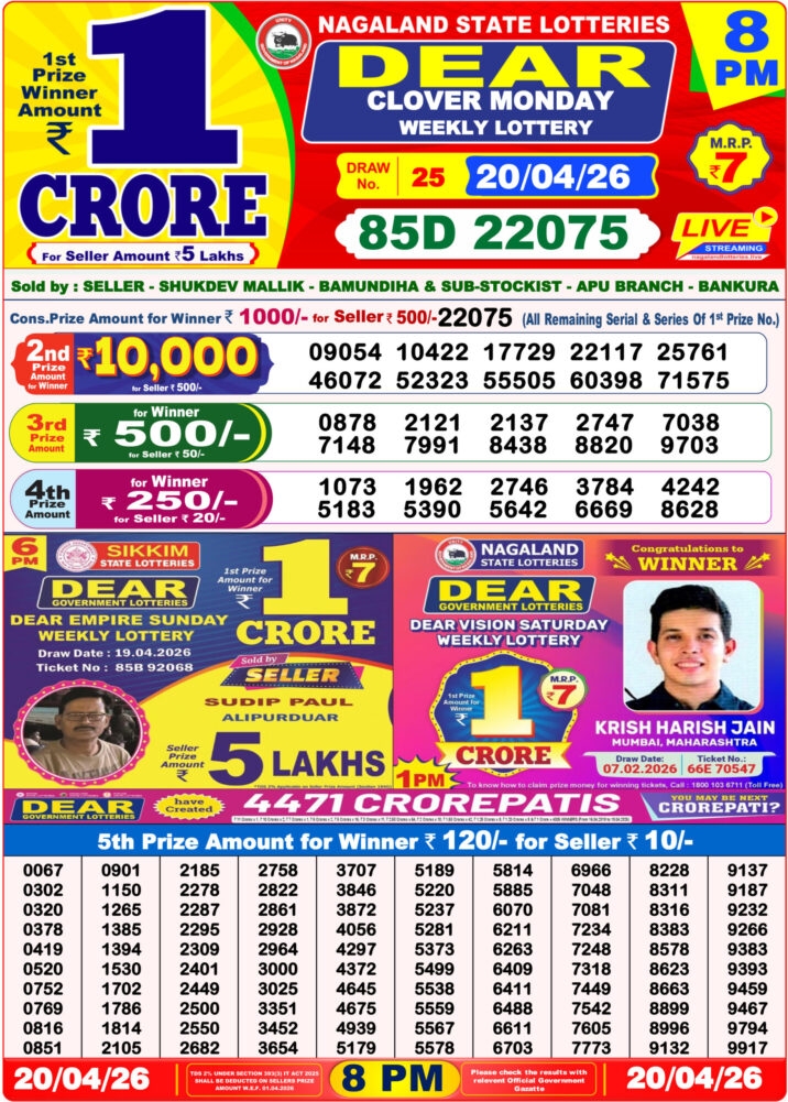 Today’s 20/04/26 scheme for the 8 PM draw is Dear Clover Monday Weekly Lottery Result.